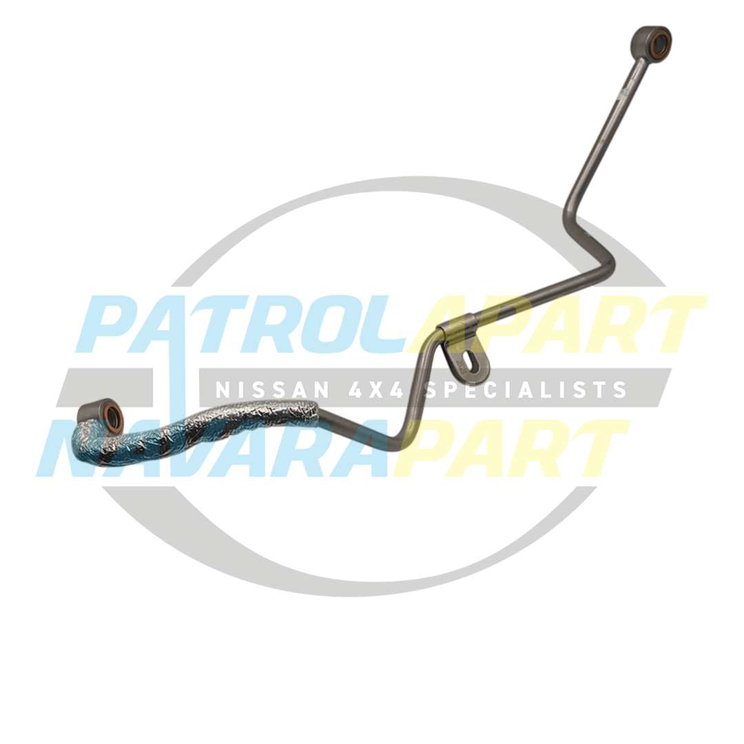 This genuine Nissan upper oil feed pipe is located in the engine bay and connects the main oil gallery to the smaller, high-pressure turbocharger on the 2.3L twin-turbo diesel engine. Its critical function is to supply a constant flow of clean, high-pressure engine oil to lubricate and cool the turbocharger's delicate internal bearings.