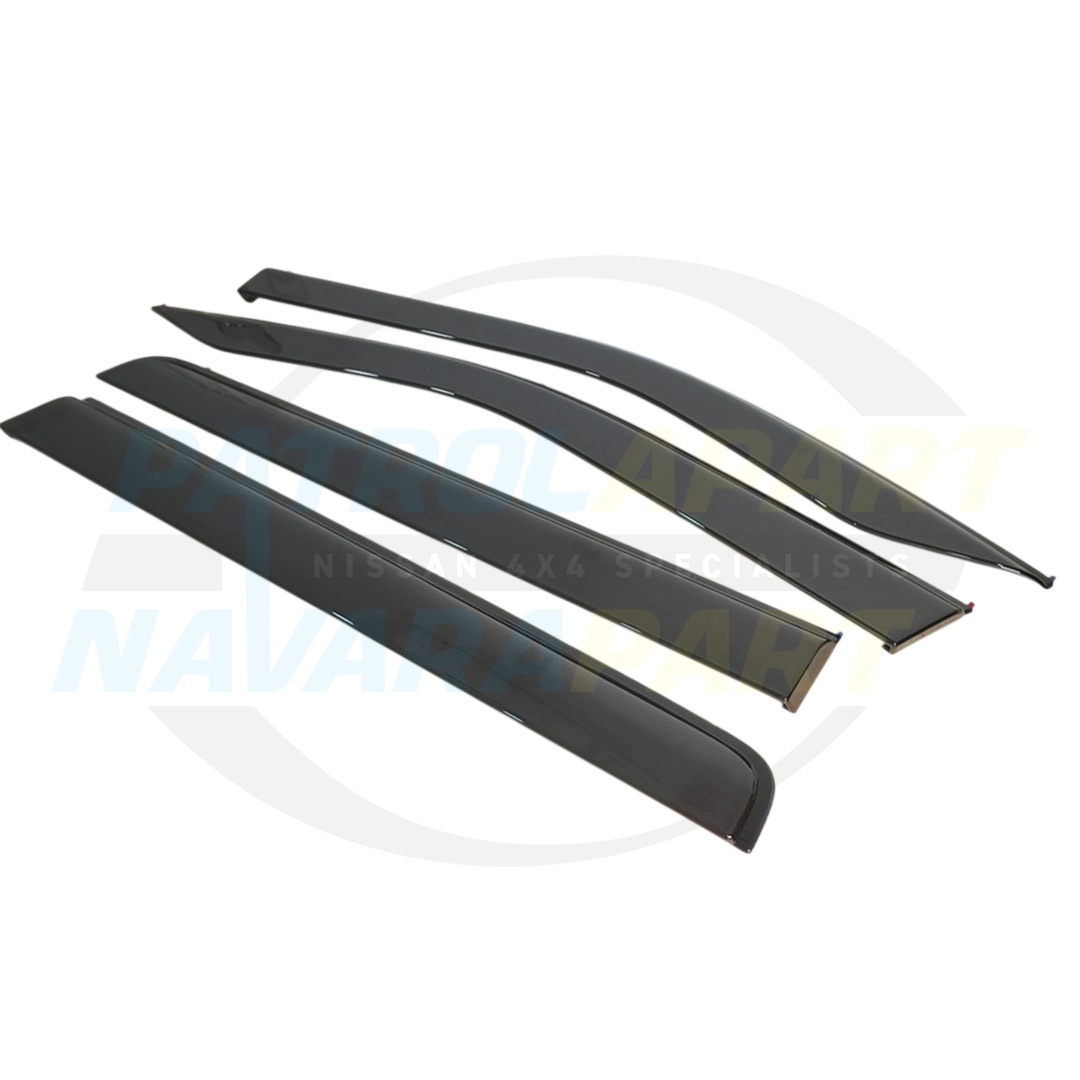 This Genuine Nissan Weathershield set is custom-designed to be fitted along the window frames of all four doors on your Navara. These slimline shields are an essential accessory for deflecting wind and rain, allowing you to enjoy fresh air circulation without letting the elements inside. This product is needed for drivers who want to reduce window fogging, minimise wind noise at speed, and protect the vehicle's interior from rain while the windows are slightly open.
